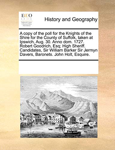 You are about to access our book library "A copy of the poll for the Knights of the Shire for the County of Suffolk, taken at Ipswich, Aug. 30. Anno dom. 1727. Robert Goodrich, Esq; High ... Jermyn Davers, Baronets. John Holt, Esquire. full version"