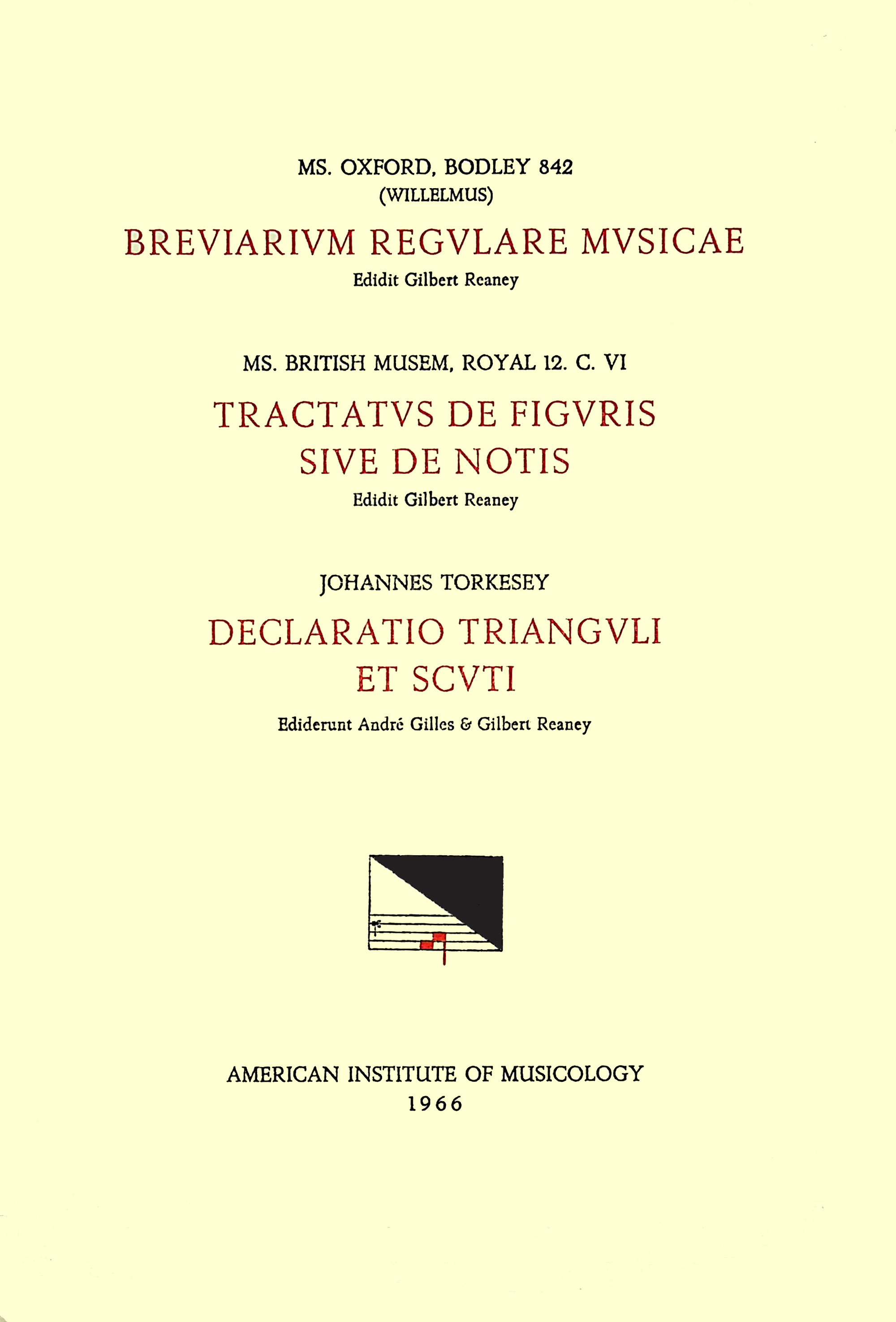 You are about to access our book library "Ebook CSM 12 a) (WILLELMUS), Breviarium regulare musicae (late 14th c.), edited by Gilbert Reaney; b) ANONYMOUS, Tractatus de figuris sive de notis (first half 14th c.), edited by G. Reaney; c) JOHANNES TORKESEY, Declaratio trianguli et scuti, edited by André G full version"
